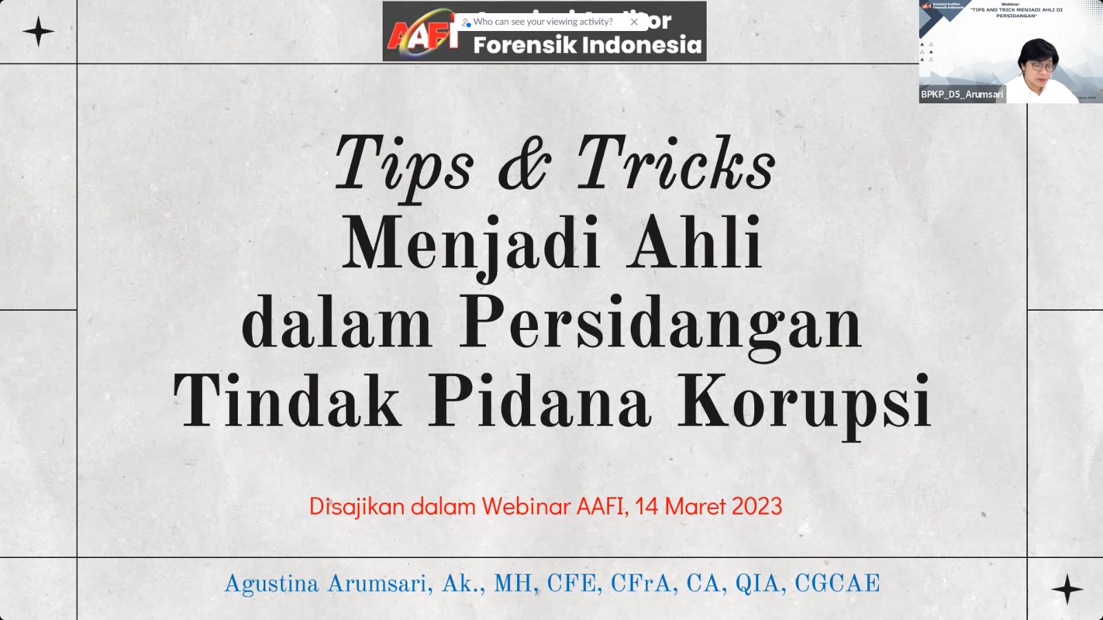 Terkait hal itu, AAFI SUWENEM menggelar webinar bertajuk Tips and Tricks Menjadi Ahli di Persidangan yang menghadirkan Ibu Agustina Arumsari, Ak., M.H., CFE, CFrA, CA, QIA, CGCAE (Deputi Investigasi BPKP) sebagai Narasumber dan Ibu Dr. Selvia Vivi Devianti S.E., M.Sc., MCP., Ak, CFrA, CFE, CSFA (Direktur Litbang BPK RI) selaku Moderator.�