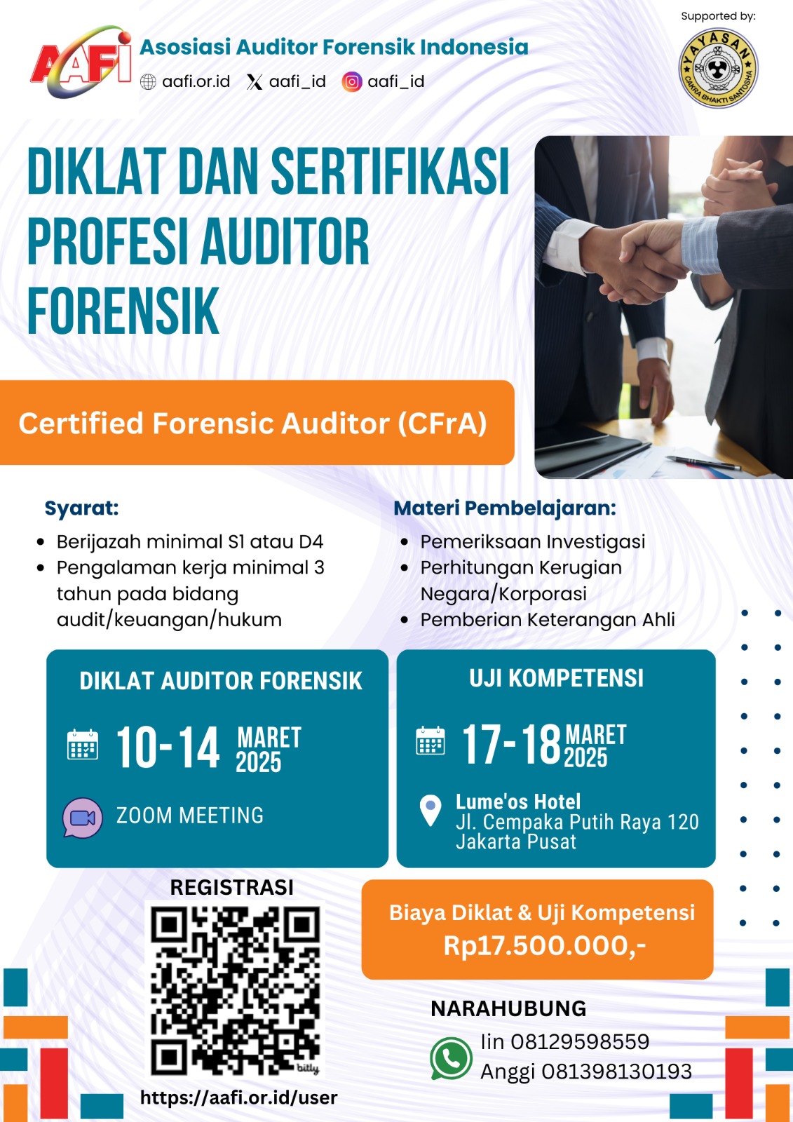 Asosiasi Auditor Forensik Indonesia Suwenem (AAFI SUWENEM), dengan dukungan dari Yayasan Cakra Bhakti Santosha, kembali mengadakan Diklat dan Sertifikasi Profesi Auditor Forensik dengan gelar Certified Forensic Auditor (CFrA). Program ini bertujuan untuk meningkatkan kompetensi para auditor dalam bidang audit investigatif dan forensik guna mendukung upaya pemberantasan tindak pidana keuangan dan korupsi.