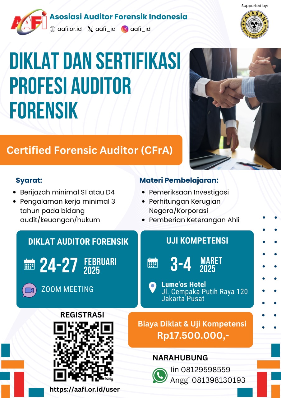 Asosiasi Auditor Forensik Indonesia Suwenem (AAFI SUWENEM), dengan dukungan dari Yayasan Cakra Bhakti Santosha, kembali mengadakan Diklat dan Sertifikasi Profesi Auditor Forensik dengan gelar Certified Forensic Auditor (CFrA). Program ini bertujuan untuk meningkatkan kompetensi para auditor dalam bidang audit investigatif dan forensik guna mendukung upaya pemberantasan tindak pidana keuangan dan korupsi.